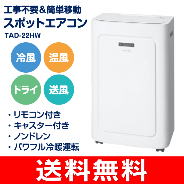価格: 43,480円 レビュー評価:0.0 レビュー数:0 ※室温調節には「排気ダクト」の設置が必要です。 ※湿度調節には「排水ホース」の設置が必要です。 ※対応窓高さ140cmより大きい場合は延長パネル(別売)が必要です。 【数量限定】【送料込み】 トヨトミ(TOYOTOMI) スポット冷暖エアコン TAD-22HW 移動ラクラク!1年中どこでも使える冷暖エアコン。 ●どこでも使える便利な移動式スポットエアコン ●温風もでるため、オールシーズン使用可能 ●好きな場所へ移動可能(ドライ機能で除湿機としても活躍) ●暖房能力1.9kW・冷房能力2.2kWのパワフル運転 ●エアコン工事不要 ●窓パネルセット付(対応窓高さ78?140cm) ●除湿量36L/日 ●ノンドレン ●工事不要 ●抗菌フィルター ●リモコン&キャスター付き ・活性炭フィルター ・風向無段階 ・12時間入/切タイマー ・着脱式リモコン ・移動用キャスター 運転モード:冷風・温風・ド (更新日時:2017/07/05 10:30) Supported by 楽天ウェブサービス |